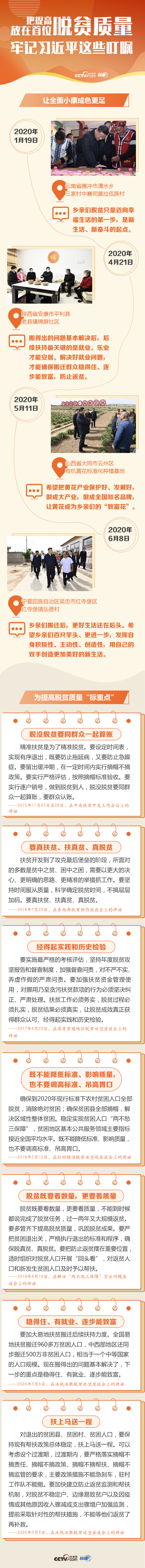 聯(lián)播+ “脫貧既要看數(shù)量,更要看質(zhì)量”“全面打好脫貧攻堅戰(zhàn),要按照黨中央統(tǒng)一部署,把提高脫貧質(zhì)量放在首位”,如何提高脫貧質(zhì)量,是習(xí)近平總書記一直思考的問題。 黨的十八大以來,習(xí)近平總書記多次深入貧困地區(qū)調(diào)研,2015年以來就打贏脫貧攻堅戰(zhàn)召開7個專題會議,作出一系列重要指示,為做好脫貧攻堅工作指明了方向。 今年是脫貧攻堅戰(zhàn)的最后一年,越是到最后,剩下的都是難啃的硬骨頭。在地方考察期間,習(xí)近平總書記時常深入基層走到鄉(xiāng)親們中間,問冷暖,聽民聲,謀發(fā)展,看變化。 溫飽問題基本解決后,總書記特別關(guān)心如何防止返貧的問題。他反復(fù)強(qiáng)調(diào)不求速成,脫貧摘帽后還要穩(wěn)一穩(wěn)、沉淀沉淀,確保經(jīng)得住歷史的檢驗。 央視網(wǎng)《聯(lián)播+》特擷取總書記關(guān)于確保脫貧攻堅質(zhì)量的經(jīng)典話語,與您一起堅定高質(zhì)量完成脫貧攻堅目標(biāo)任務(wù)的必勝信心。